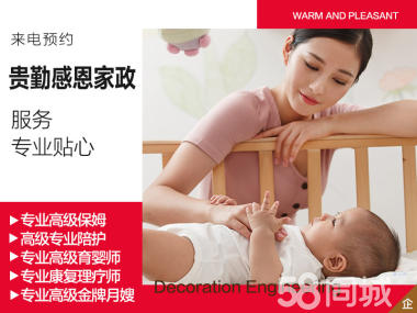 专业提供保姆月嫂、育婴师、育儿嫂、病人康复护理,价格合理实惠,质量安全可靠,坚持诚实可靠的人员输送,定期的回访员工的工作质量以及服务态度。 【公司介绍】 专业提供保姆月嫂、育儿嫂、育婴师、病人康复护理等家政服务。对前期预从业人员精心挑选,对即将上刚人员细心,对客户用心服务,对雇主的家庭用心服务,公司对雇主也会进行贴心回访。以诚实守信为荣,提供优质服务,恪守诚实信用,优质为您服务 【服务项目】 1、康复理疗、病老护理 2、陪护:医院护工、家庭陪护。 3、保姆:家务、洗衣、做饭、照顾老人、病人护理、接送孩子,带小孩。 4、白班保姆、住家保姆:家务、洗衣、做饭、照顾老人、病人护理、接送孩子、带小孩。 5、月嫂:产褥期护理,新生儿护理,日常家庭保洁整理,一日三餐。 6、育儿嫂:婴儿营养配餐,婴幼儿日常护理,婴幼儿智力开发,家庭日常护理。 7、催乳师:产妇乳房护理,揉奶、开奶。